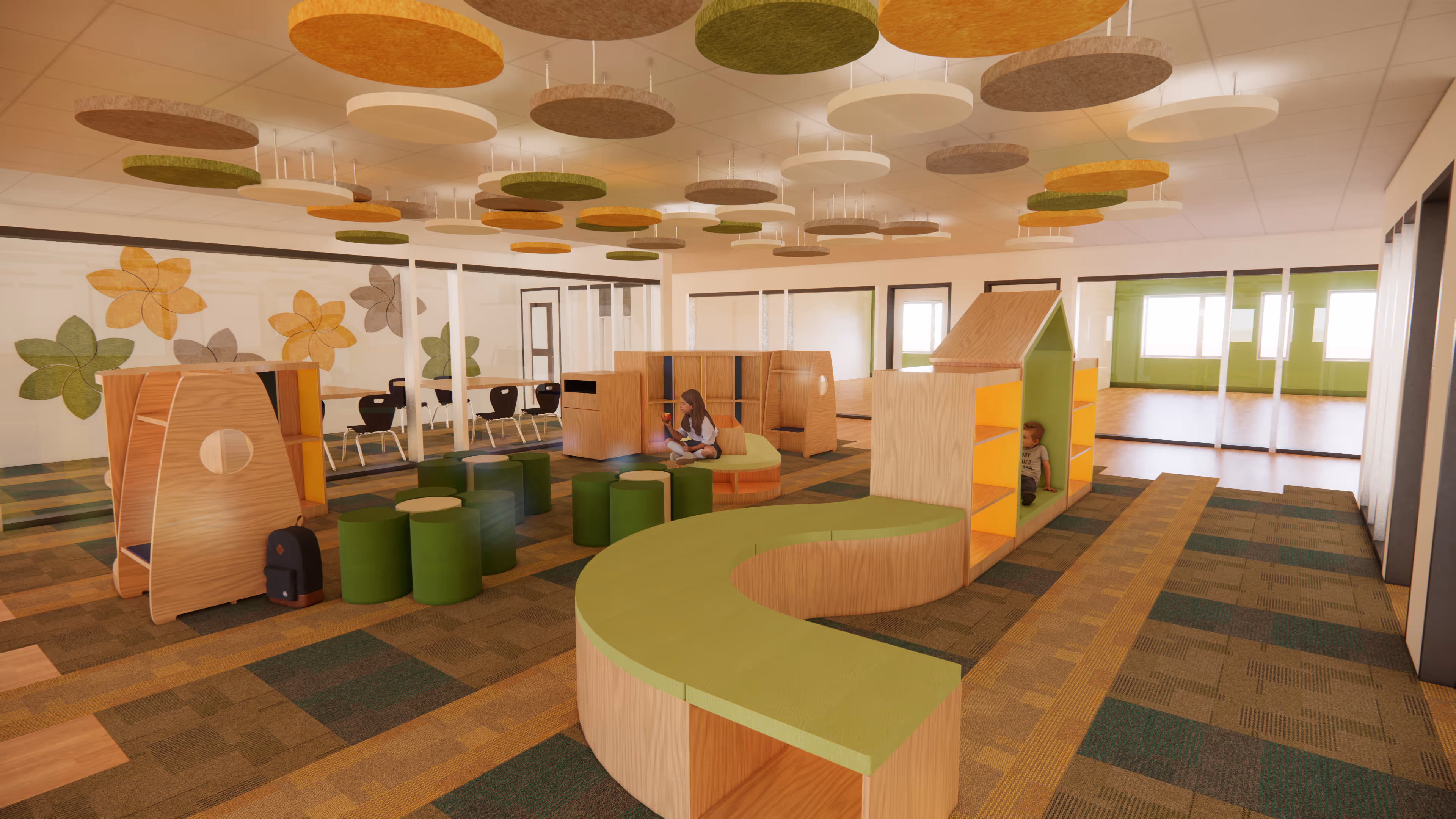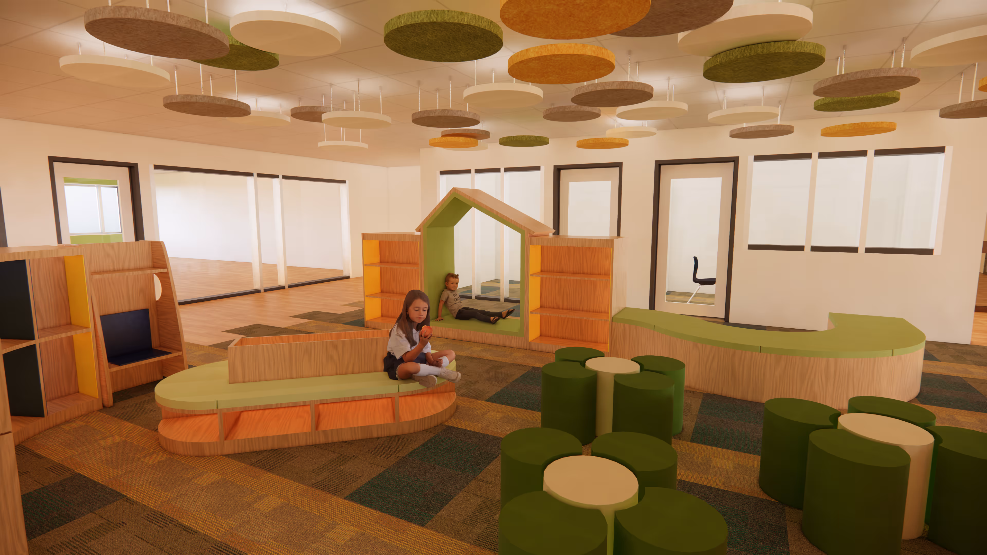 The program includes four Kindergarten classrooms, twenty-five standard classrooms, art and science rooms, multiple commons, and a childcare centre for infants through preschoolers. A central feature staircase doubles as a collaborative amphitheatre, reinforcing the school’s commitment to interactive learning and fostering a culture of engagement, inclusivity, and shared discovery.