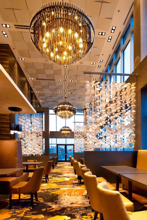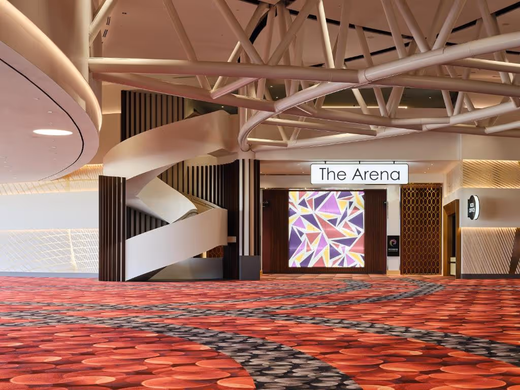 The resort’s 96,000 sq. ft. gaming floor anchors the experience with over 2,300 slot machines, 90 table games, and a modern stadium gaming zone. SPA’s design approach prioritized atmosphere and flow—balancing spectacle and comfort through sculpted ceilings, layered lighting, and resilient finishes built for a 24-hour operation. The gaming hall ceiling, featuring geometric lighting bands and integrated acoustics, became a signature visual landmark—later influencing the design of Great Canadian’s Toronto resort at Woodbine.