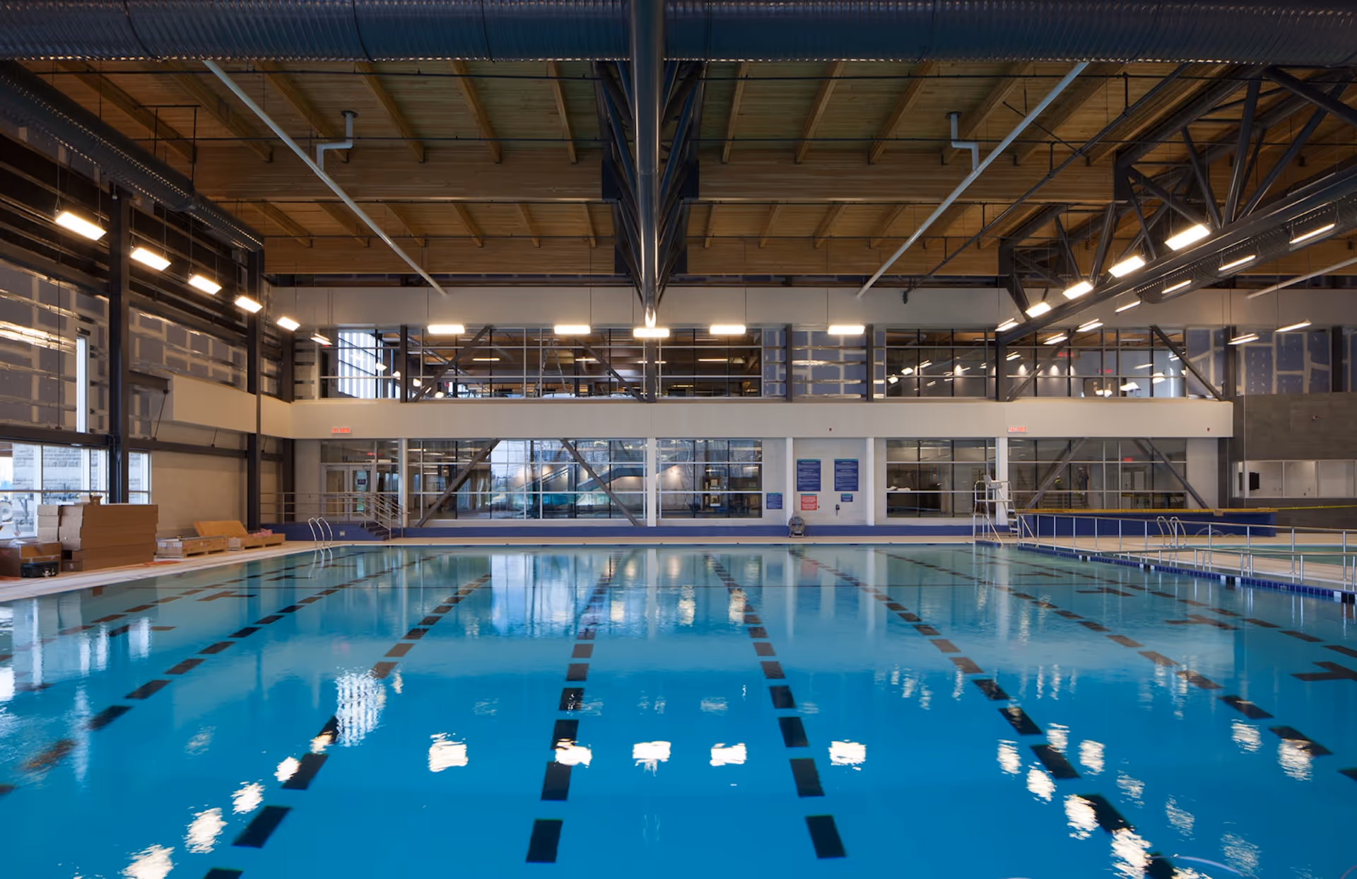 The complex offers a range of community and recreation facilities, including a 3,500 sq. ft. fitness facility featuring cardio and weight training, two large gymnasiums complete with changerooms, community rooms, and various multipurpose rooms. One of the most popular aspects of the plan was the eight-lane swimming pool. Traditionally, city recreational facilities feature six-lane pools, but the public was so adamant that an eight-lane pool be installed, the community steering committee raised $1.7 million to put toward the cost.
