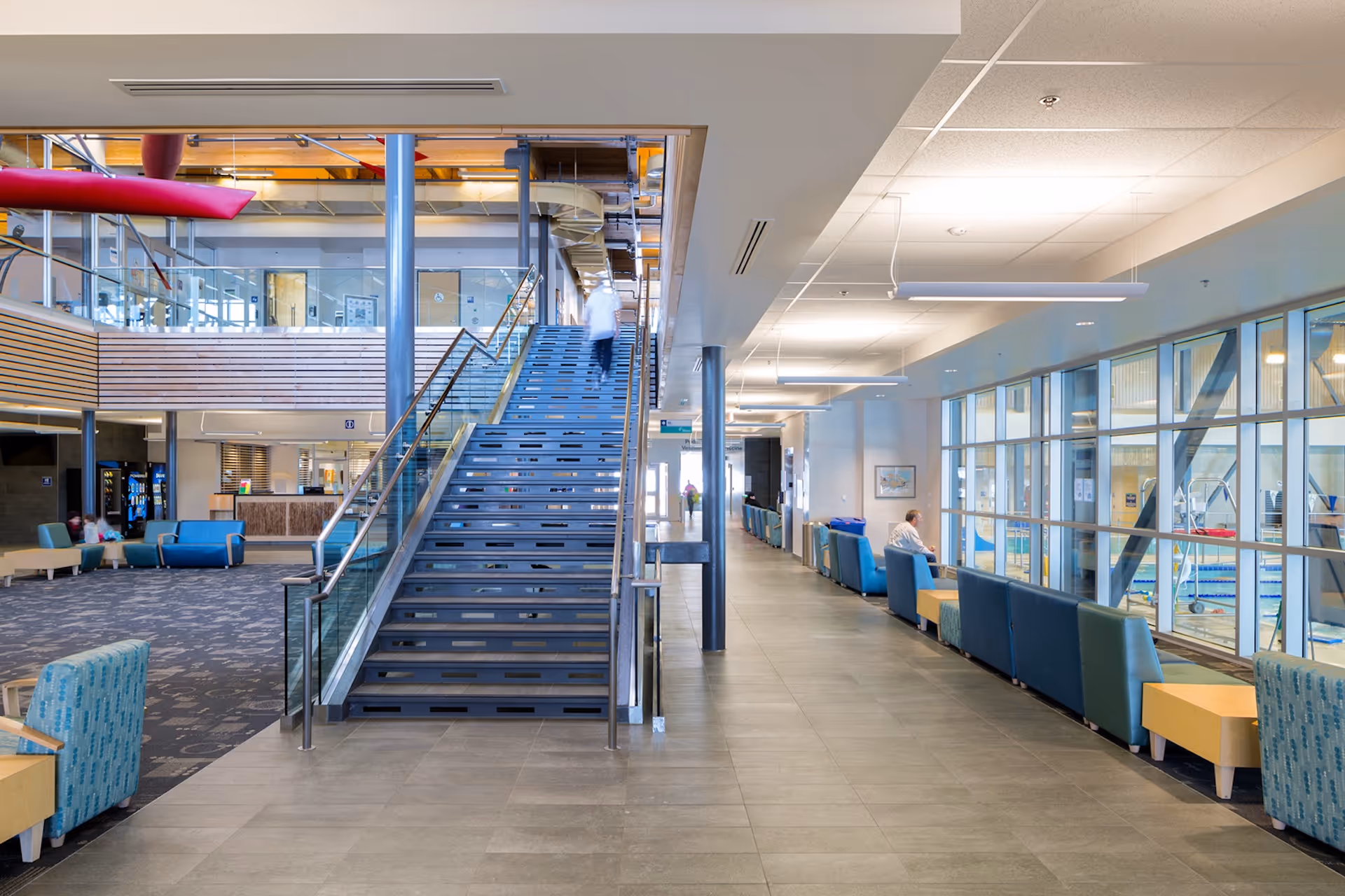 The swimming pool facility is located in the north-west end of the building. It has a double-height space over the lap pool deck, with upper storey windows to the green roof. The ceiling drops to single height over the leisure pool area and change-room access points. Glazing in the lobby/reception and entrance provide viewing areas down onto the pool deck, which is 0.6 metres below the floor level of the lobby/reception.